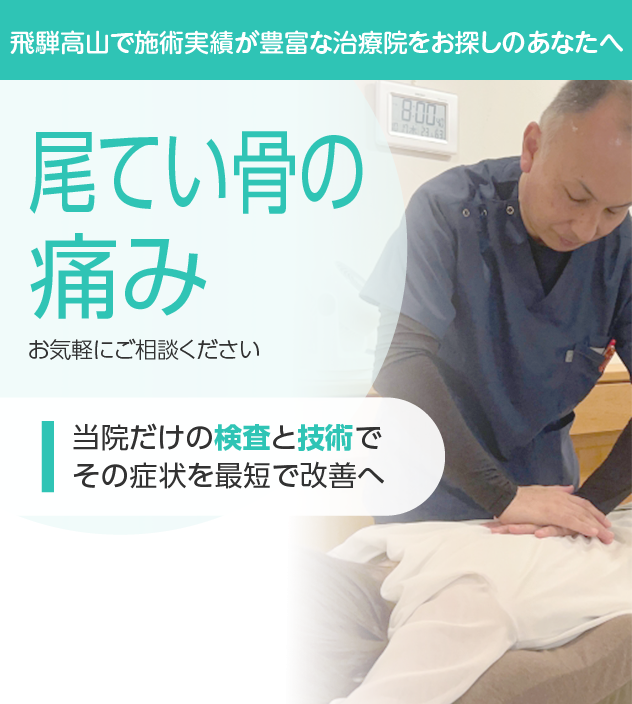リラクゼーション的なマッサージでは尾てい骨の痛みが根本的に改善することは難しく、繰り返す痛みや慢性的に尾てい骨の痛みの自覚症状がある場合は今より悪くなる前に早めに対処しておく必要があります。