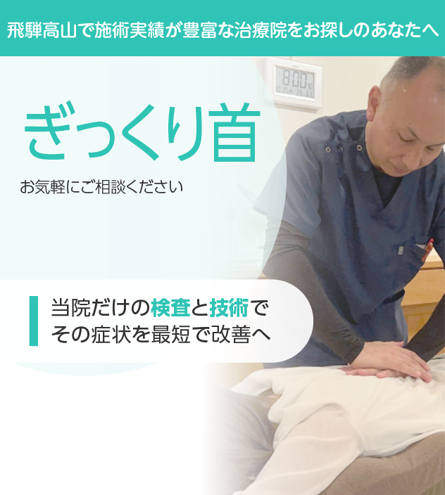 その上で、一人一人の状態に合わせた完全オーダーメイドの治療を提供します。やさしく丁寧な施術で、とてもソフトなタッチのため痛みはありません。患者に負担の少ない治療は地元高山以外の50キロ以上離れた地区からも通院する人がいるほどです。